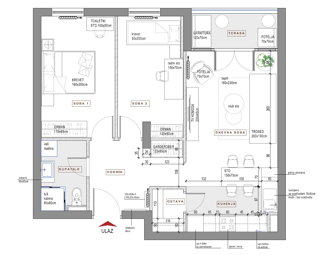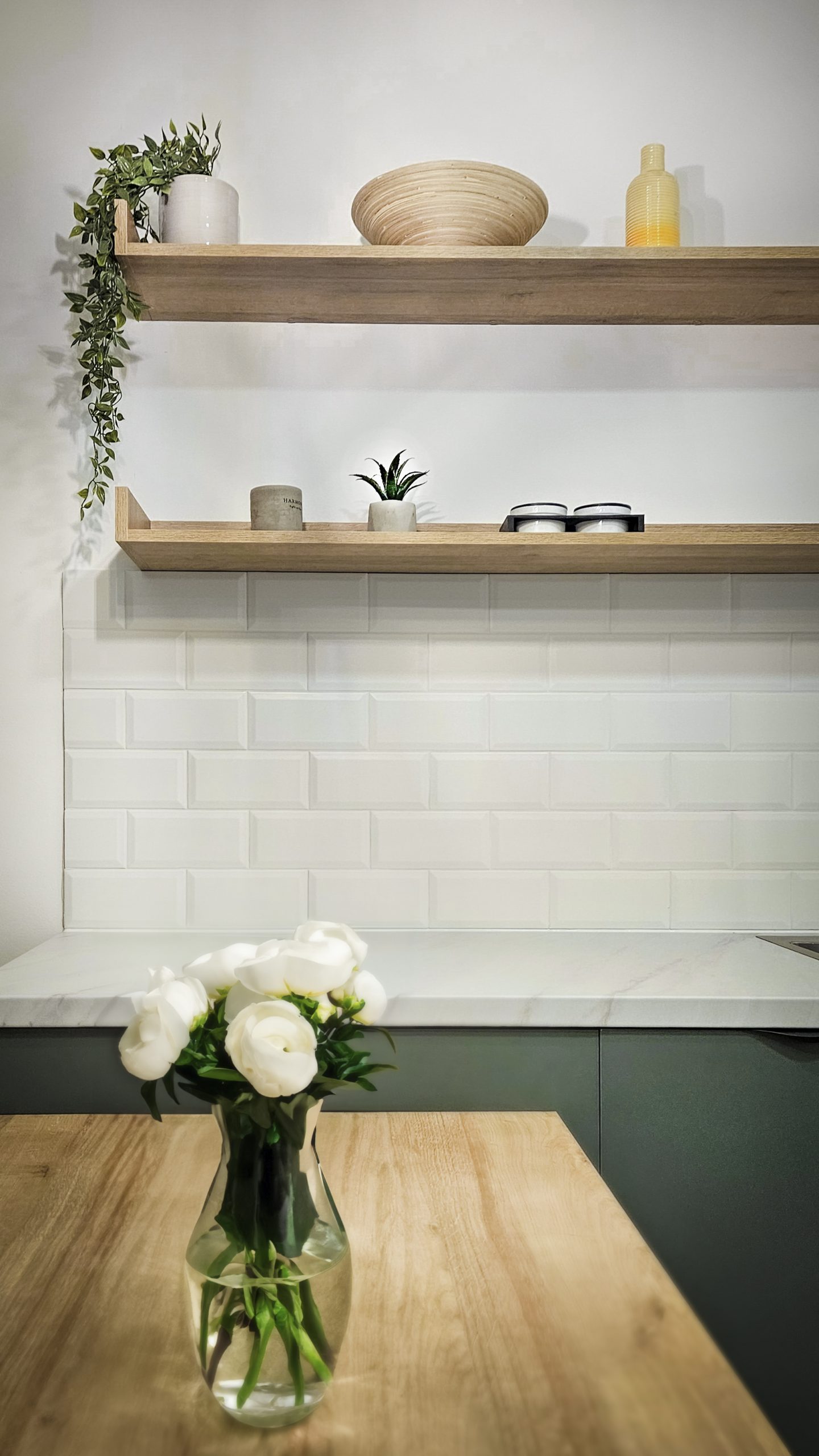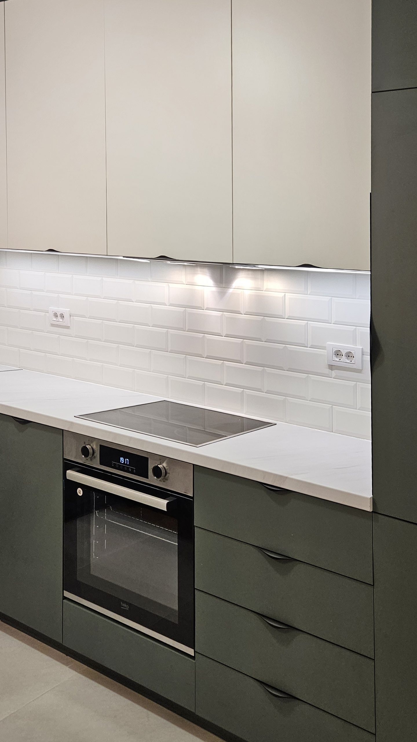 Interior design for Private Apartment in new residential complex in Belgrade, Serbia. This compact open-plan interior features a stylish, modern kitchen that continues to the living area. The design combines matte sage green lower cabinets with crisp white uppers, creating a fresh, balanced contrast. Clean lines and minimalist fronts enhance the contemporary aesthetic, while the white subway tile backsplash adds subtle texture and timeless appeal.